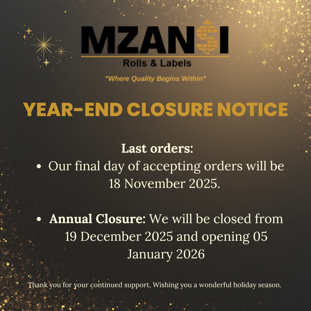 #YearEndClosure #MzansiRollsAndLabels #SeasonGreetings
